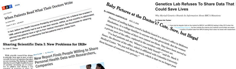 In collaboration with the Institute for Human Genetics and EngageUC at UCSF, and Personal Genome Project at Harvard University, we will explore the practical, ethical and legal implications of emphasizing benefits of sharing over the need for privacy at a workshop planned for Spring 2015 in Washington DC. A few of the questions to be tackled at the workshop: What if, instead of emphasizing the imperative of protecting privacy, we emphasized the potential benefits from sharing? Would most patients agree to let their information be shared? more →