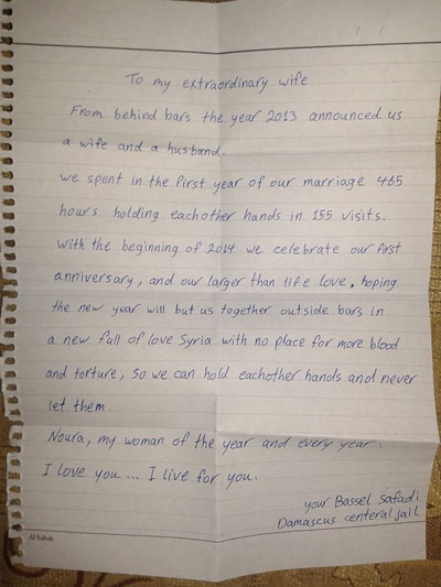 Our friend Niki Korth recently created Letters for Bassel, a blog that collects letters to Bassel from friends or people who’ve been inspired by his story. She recently published this heartbreaking letter that Bassel wrote to his wife Noura on their first anniversary:
