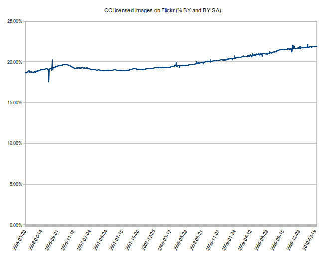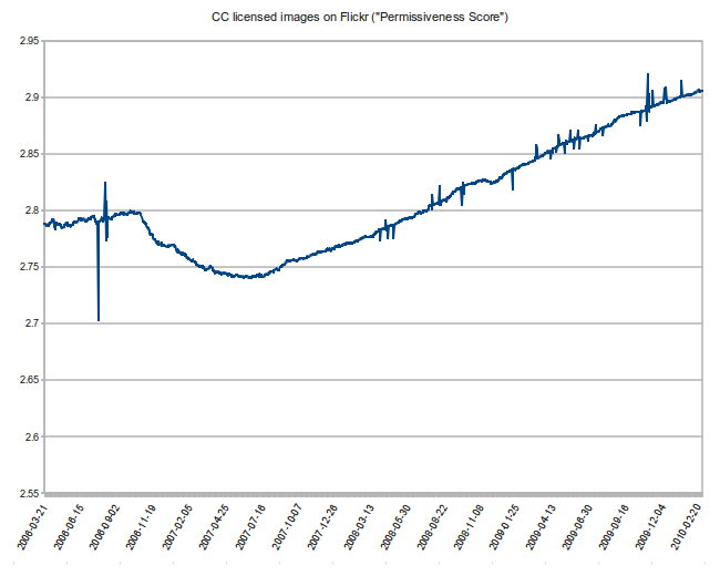 While the data for CC adoption on the web at large is much less certain than that for a single site such as Flickr, some indicate that both total use and permissiveness have increased much more on the web at large than on Flickr alone. Look for a post on this in the next month.