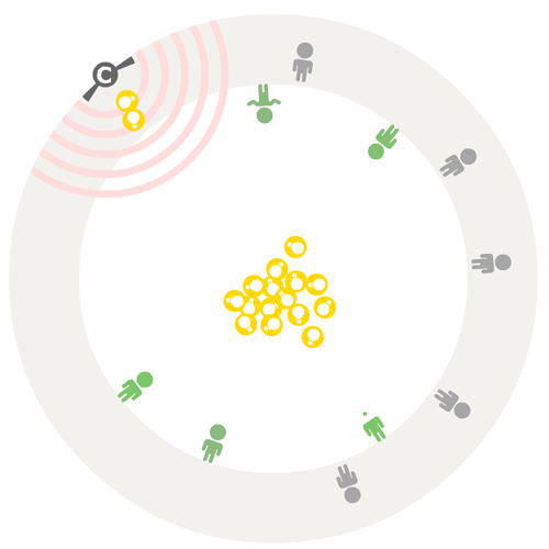 A circular field represents The Common, where knowledge can be freely shared and created; your job is to maintain a healthy ecology of yellow idea-bubbles bouncing from person to person before they can be sucked into the dark outer ring representing the forces of The Market. Your cursor, shaped like the Creative Commons logo, pushes the ideas around with a sort of reverse-magnetic repulsion field (a clever alternative to the typical shooting, eating or jumping-on-top-of-and-smooshing actions of many other 2-D games). People who absorb free, round ideas stay green and happy, while those who only consume square market-produced ones become grey and inverted.