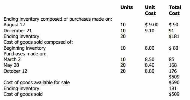 To illustrate, assume that the company in can identify the 20 units on hand at year-end as 10 units from the August 12 purchase and 10 units from the December 21 purchase. The company computes the ending inventory as shown in ; it subtracts the USD 181 ending inventory cost from the USD 690 cost of goods available for sale to obtain the USD 509 cost of goods sold. Note that you can also determine the cost of goods sold for the year by recording the cost of each unit sold. The USD 509 cost of goods sold is an expense on the income statement, and the USD 181 ending inventory is a current asset on the balance sheet. The specific identification costing method attaches cost to an identifiable unit of inventory. The method does not involve any assumptions about the flow of the costs as in the other inventory costing methods. Conceptually, the method matches the cost to the physical flow of the inventory and eliminates the emphasis on the timing of the cost determination. Therefore, periodic and perpetual inventory procedures produce the same results for the specific identification method.