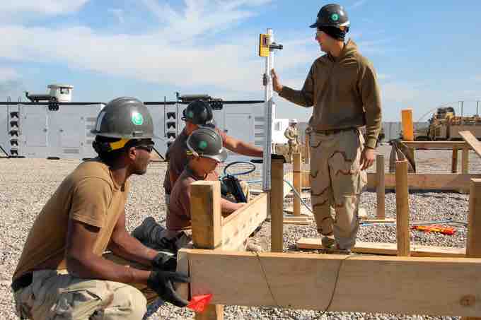 U.S. Navy Petty Officer 3rd Class Channing Connelly, right, uses a laser-guided level to check for proper frame elevation as other Seabees adjust a frame board while working on a building foundation at a patrol base in Mahawil, Iraq, Feb. 4, 2009.