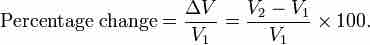 The percent change in value is the change in value from PV to FV (V2 to V1) divided by PV (V1) times 100%.