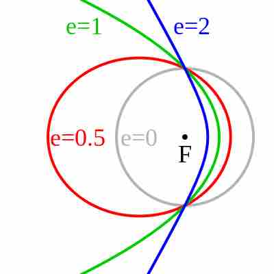 A diagram of the various forms of the Kepler Orbit and their eccentricities. Blue is a hyperbolic trajectory (