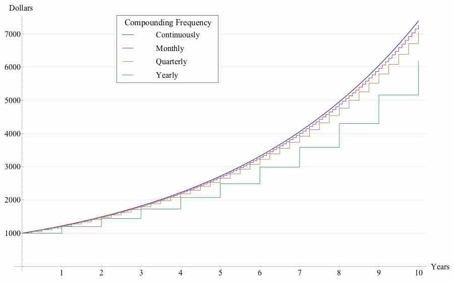 Starting with a principal of $1000, interest rises exponentially. The graph shows that the more frequent the number of compounding periods the more interest is accrued and shows this visually for yearly, quarterly, monthly and continuous compounding.