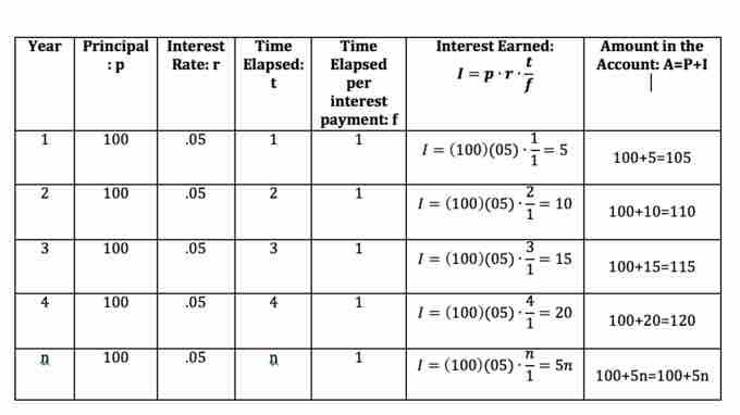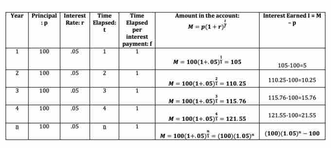 The table below shows the calculations, interest earned and total amount in the account after 1, 2, 3, 4, and n years.