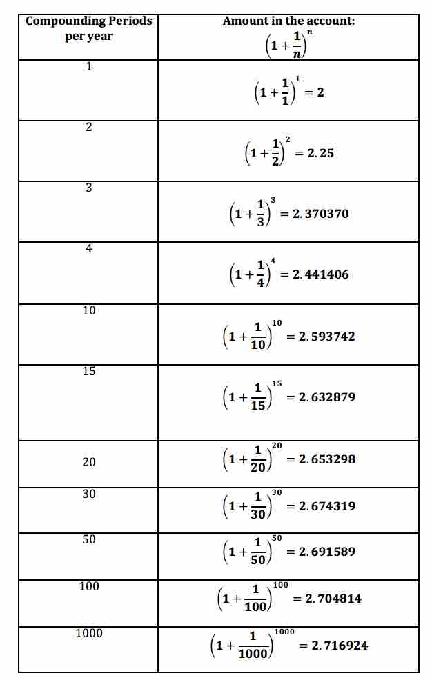 The formula for compound interest with the number of compounding periods going to infinity yields the formula for compounding continuously. It should come as no surprise that this formula involves the number