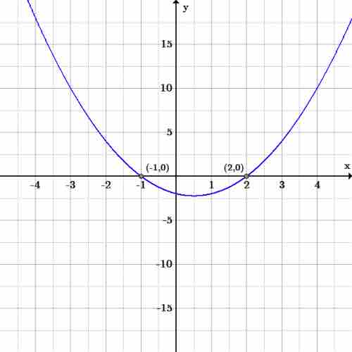Because Δ is greater than zero, the function has two distinct, real roots. Checking graphically, we can confirm this is true; the zeros of the function can be found at