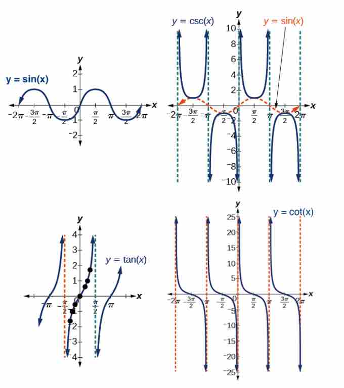 Sine, cosecant, tangent, and cotangent are odd functions, and are symmetric around the origin.