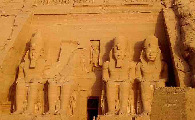 This famous work depicts four repeating statues of Ramses II, following the tradition of deifying pharaohs.