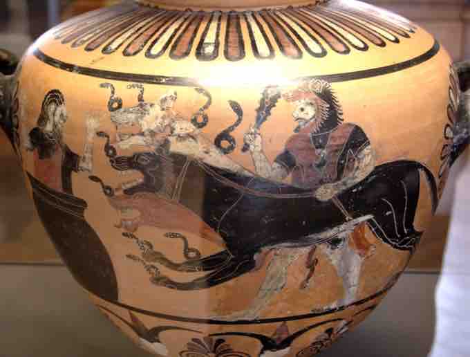 Eagle Painter. Hercules bringing Cerberus back to King Eurystheus. Black figure hydra. c. 525 BCE.
