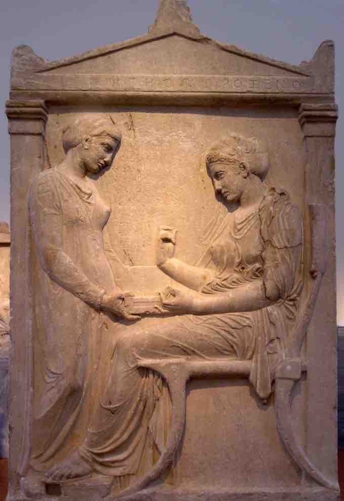 The Grave Stele of Hegeso from the Kerameikos Cemetery outside of Athens depicts a seated woman. The stele dates to 400 BCE, and the woman fits the stylistic representation of women at this time. Hegeso sits on a chair with her feet resting on a footstool. She is elegantly dressed in long flowing drapery. A female attendant in simple dress stands before her holding a small box, from which Hegeso chooses jewelry. The jewelry is now absent because it was only a painted detail, as opposed to carved in relief. Both women wear transparent clothing that clings to their body to relieve their feminine form, although the clothing is more revealing on Hegeso than her servant. This style, known as "wet drapery," also appears on the Temple of Athena Nike in Athens. Both figures are expressionless and emotionless.