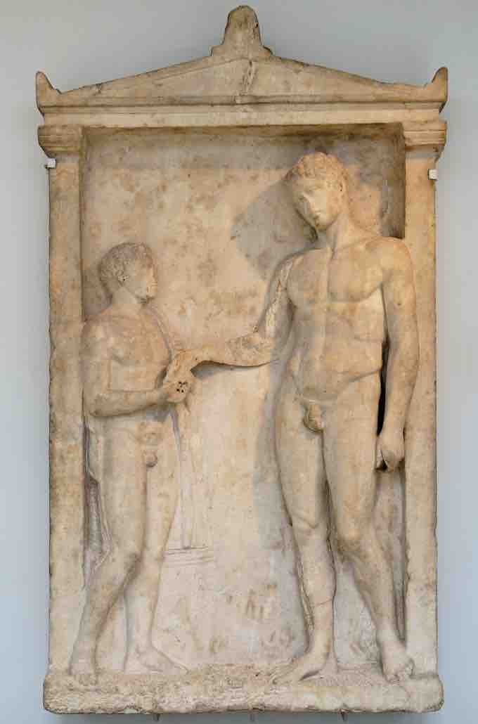 The Grave Stele of an Athlete (early fourth century BCE) from the island of Delos depicts a male athlete receiving lekythos of oil from a male youth. The athlete's body is reminiscent of Polykleitos's Doryphoros. It is athletic, and the muscles are defined through modeling instead of lines. He stands in a contrapposto pose with a cocked head, reaching for the flask held by the young attendant. The youth's age is defined not by his well-built body (which is very similar to that of the athlete) but by his diminutive size.