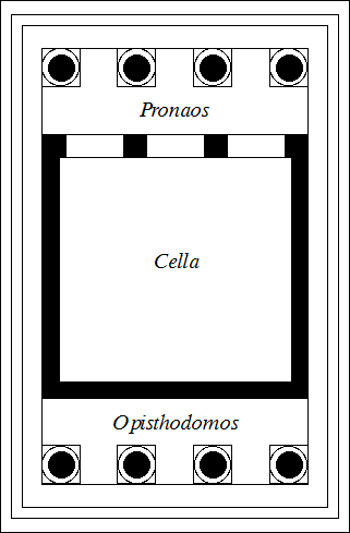 The Temple of Athena Nike (427-425 BCE), designed by Kallikrates in honor of the goddess of victory, stands on the parapet of the Acropolis, to the southwest and to the right of the Propylaea. The temple is a small Ionic temple that consists of a single naos, where a cult statue stood fronted by four piers. The four piers aligned to the four Ionic prostyle columns of the pronaos. Both the pronaos and opisthodomos are very small, nearly non-existent, and are defined by their four prostyle columns.