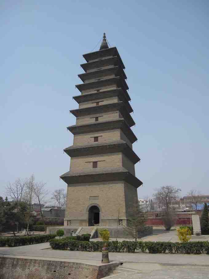 This square-base stone and brick pagoda was built in the year 636 CE during the reign of Emperor Taizong of the Tang Dynasty (618-907). It stands at a height of 48 m (157 ft) and has been well preserved since its initial construction. The monastery that once surrounded the pagoda, however, has largely been destroyed, with the exception of a few structures.