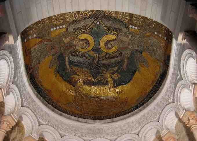 The most famous mosaic in Charlemagne's chapel showed an enthroned Christ, worshiped by the Evangelist's symbols and the 24 elders of the Apocalypse. This mosaic no longer survives, but a restored one remains in the apse of the oratory at Germigny-des-Prés (806), which was discovered in 1820 under a coat of plaster, and shows the Ark of the Covenant adored by angels.