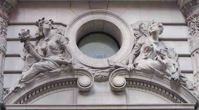 Beaux-Arts building decoration presenting images of the Roman goddesses Pomona and Diana. Note the naturalism of the postures and the channeled rustication of the stonework.