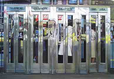 Richard Estes reproduces in a paint the complex image of a reflected urban environment on a telephone booth.