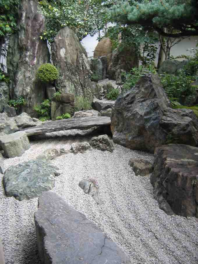 The garden at Daisen-in (1509-1513) took a more literary approach than Ryōan-ji. A "river" of white gravel represents a metaphorical journey through life—beginning with a dry waterfall in the mountains, passing through rapids and rocks, and ending in a tranquil sea of white gravel with two gravel mountains.