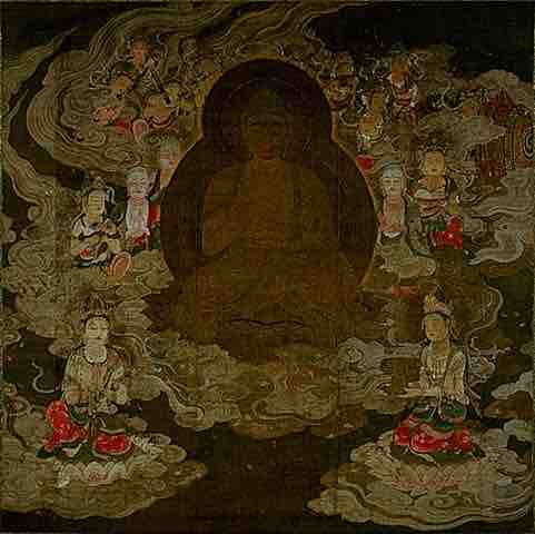 Color on silk, late Heian period. The Raigo image was introduced in Japan by the Pure Land School of Art during the Fujiwara Regency.