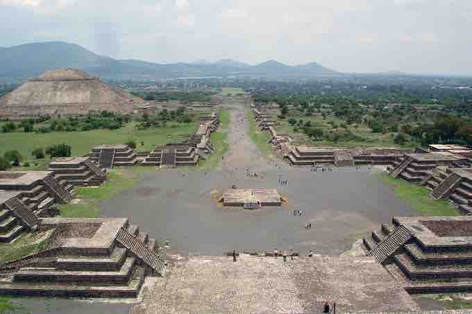 View from the Pyramid of the Moon down the Avenue of the Dead to the Ciudadela and the Temple of the Feathered Serpent. The Pyramid of the Sun is at the middle left. The avenue is over a mile long.