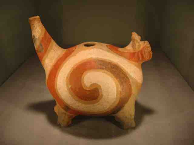 This Mississippian culture ceramic effigy jug was found at Rose Mound in Cross County, Arkansas, and dates from 1400-1600.