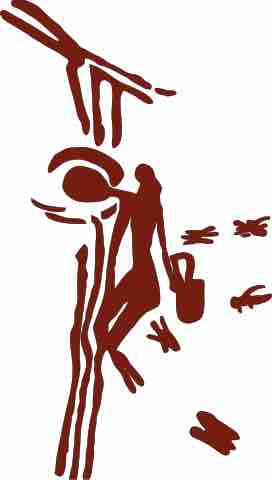 The Man of Bicorp holding onto lianas to gather honey from a beehive as depicted on an 8000-year-old cave painting near Valencia, Spain.