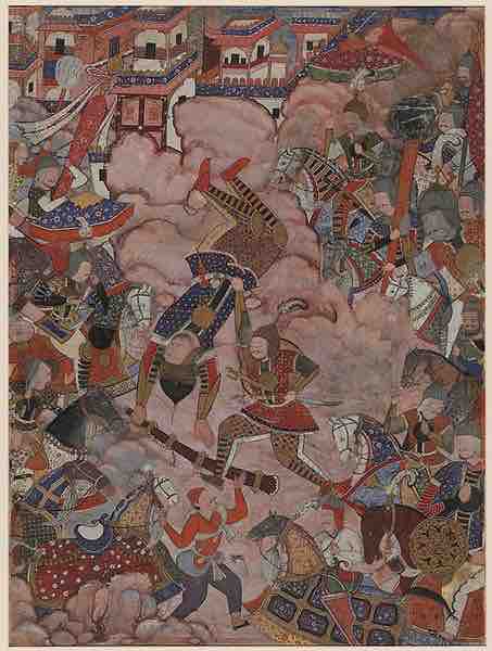 This painting is number 38 in the 7th volume of the Hamzanama. It depicts a battle scene in which the protagonists, Khwajah 'Umar and Hamzah, and their armies engage in fierce battle. Originally clearly depicted, the faces were erased by iconoclasts and then repainted in more recent times. Only the face of the groom wearing an orange turban in the center of the left edge has been left untouched.