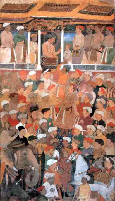 Illustration of a court scene from the Jahangirnama, c. 1620. Jahangir makes a public appearance on a balcony as a large group of courtiers stand below.