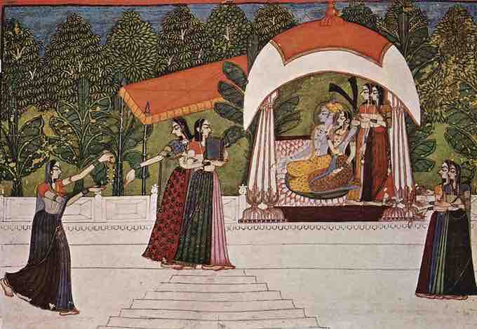 An 18th century Rajput painting by the artist Nihâl Chand, chief painter at the court of Kishangarh. Krishna and his companions are by far the most popular theme of Rajput painting.