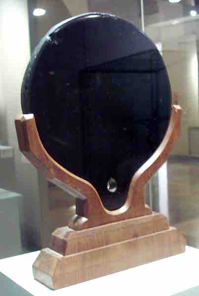 This mirror was carved from obsidian on a modern wooden base and is currently held in the Museum of the Americas, Madrid.