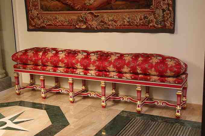 The style of Louis XIV at Versailles is characterized by richly woven red and gold fabrics or brocades, heavy gilded plaster molding, large sculpted side boards, and heavy marbling.