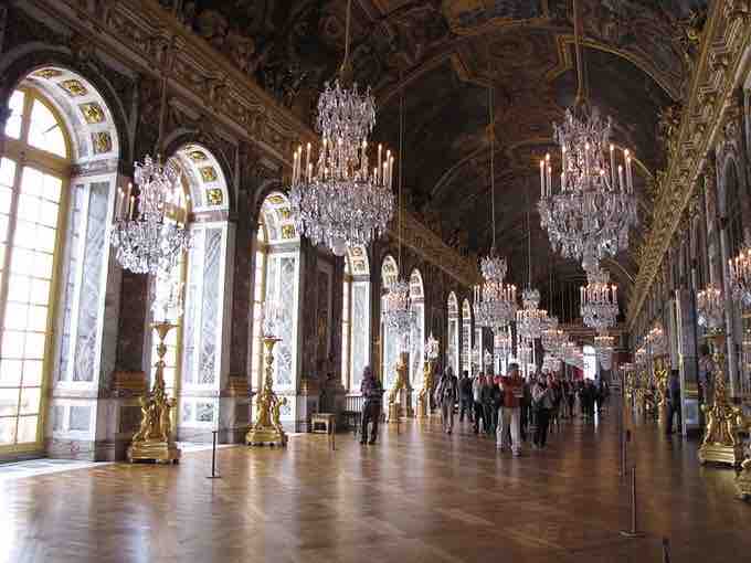 The Hall of Mirrors is the central gallery of the Palace of Versailles and is one of the most famous rooms in the world. The main feature of this room is a series of 17 mirrored arches that reflect 17 arcaded windows overlooking the gardens. Each arch contains 21 mirrors. The arches are fixed between marble pilasters upon which bronze symbols of France are embedded.