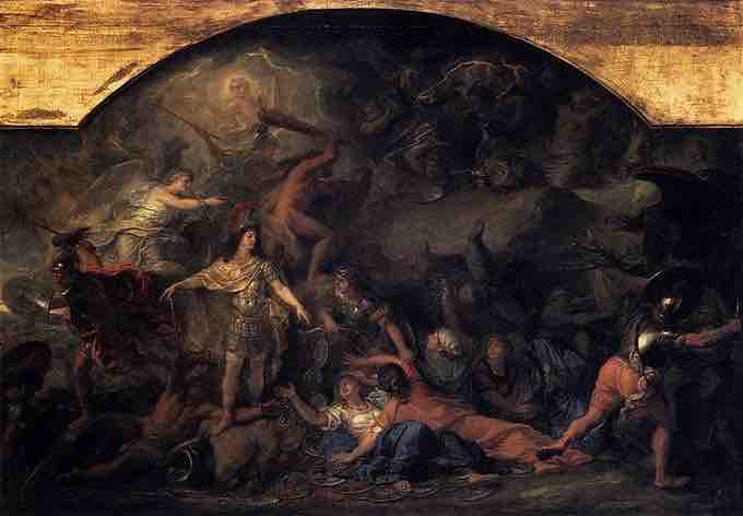 Charles Le Brun worked primarily for King Louis XIV, and his most important works reside at the Palace of Versailles. Mostly producing battle pieces and altarpieces, Le Brun's paintings exemplify a synthesis of Baroque and Classical styles.