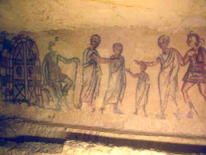 Charun guards the gate to the Underworld, while Vanth guides the deceased to the gate. Fresco. Third century BCE. Tomb 5636, Monterozzi Necropolis, Tarquinia, Italy.