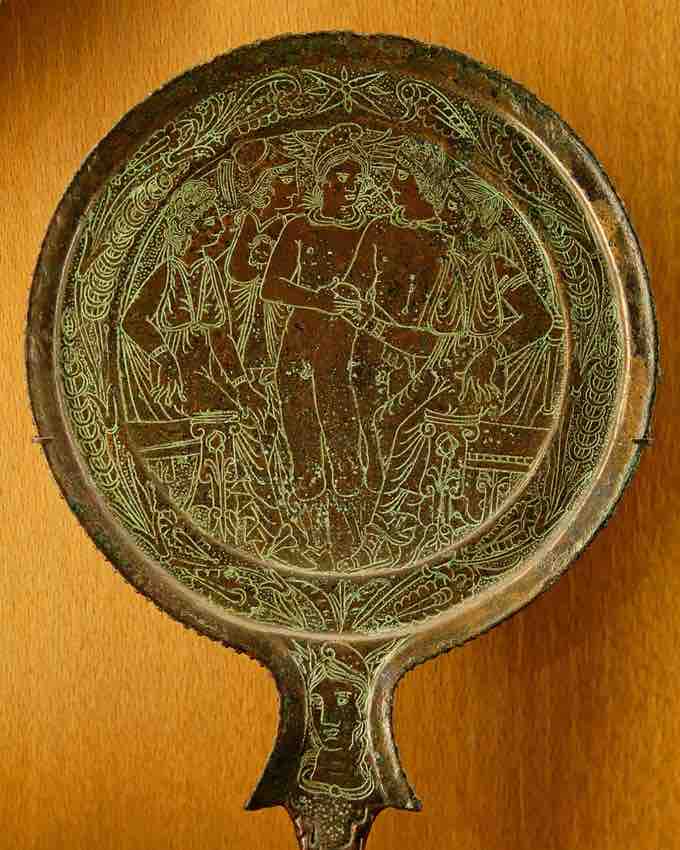 Mirror with an engraving of the Judgment of Paris. Bronze. 4th-3rd century BCE.