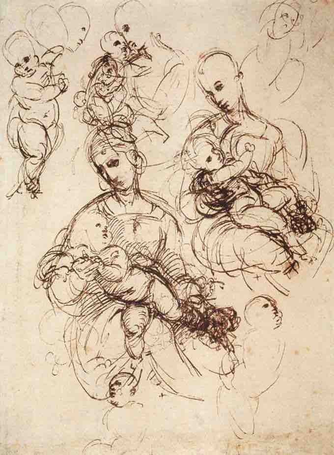 As evidenced in his sketches for the Madonna and Child, Raphael used different drawings to refine his poses and compositions, apparently to a greater extent than most other painters. Most of Raphael's drawings are rather precise—even initial sketches with naked outline figures are carefully drawn, and later drawings often have a high degree of finish, with shading and sometimes highlights in white. They lack the freedom and energy of some of da Vinci's and Michelangelo's sketches, but are almost always very satisfying aesthetically.