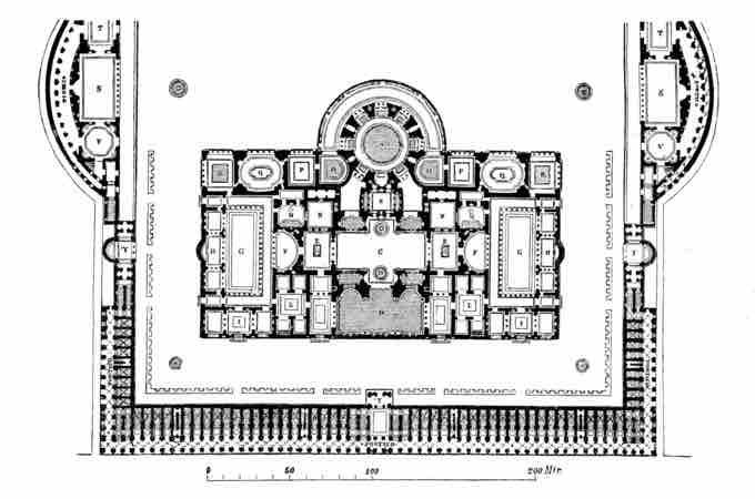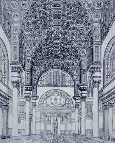 This artist’s reconstruction shows a groin-vaulted interior, Composite columns, and decorative panels on the ceiling. Human figures have been added for scale.