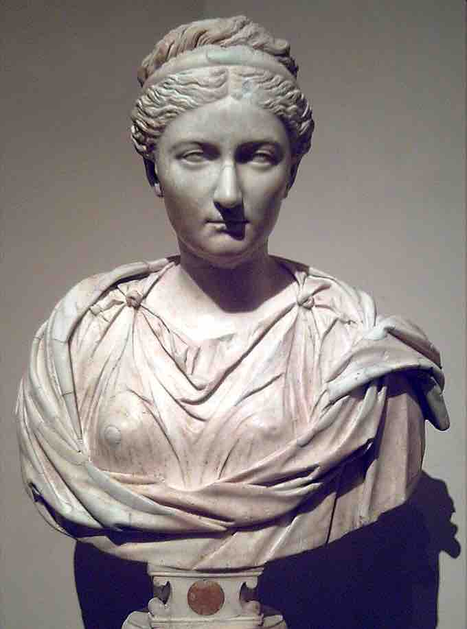 This profile view of Pompeia Plotina shows the long braid worn behind the crown-like pile of hair in the front.