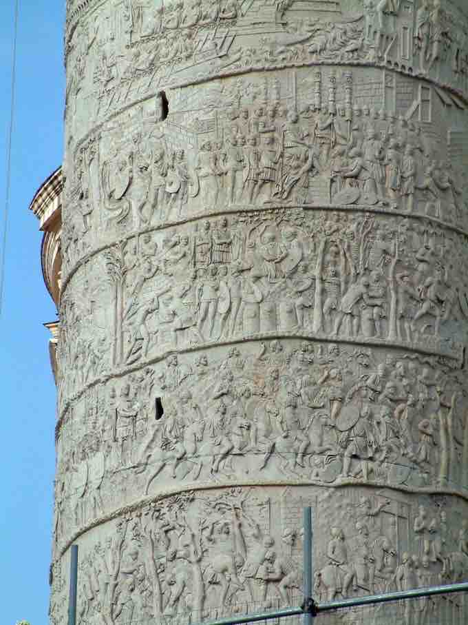 The frieze depicts over 150 episodes with more than 2,500 figures. The scenes show the Roman army preparing for and war, including scenes of moving the army, building fortifications, Emperor Trajan addressing the troops, battles, and the eventual surrender by the Dacians. Only one quarter of the narration depicts battles, while the remaining panels depict scenes of preparation and other activities. The heavy emphasis on preparation, instead of battle, emphasizes the Romans' organization and the power behind the army. The visual narration is depicted in low relief (bas relief) and relies little on naturalistic detail, preferring to show some scenes in multiple perspectives and with figures on different ground lines. Important characters, such as Trajan, reappear throughout the frieze and are easily identified. Trajan himself appears 59 times, leading his troops as the head of the army and the empire. With the exception of the appearance of a few Victory figures and a river god, the Romans and Trajan are shown conquering the Dacians under their own power, though their own superiority over their enemy, without the help of divine intervention.