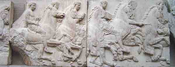 Horsemen in the processional scene on the Ionic frieze of the Parthenon. Acropolis, Athens, Greece. ca. 447-438 BCE.