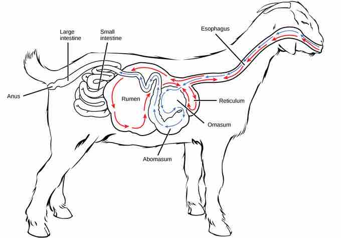 To help digest the large amount of plant material, the stomach of the ruminants is a multi-chambered organ . The four compartments of the stomach are called the rumen, reticulum, omasum, and abomasum. These chambers contain many microbes that break down cellulose and ferment ingested food. The abomasum, the "true" stomach, is the equivalent of the monogastric stomach chamber. This is where gastric juices are secreted. The four-compartment gastric chamber provides larger space and the microbial support necessary to digest plant material in ruminants. The fermentation process produces large amounts of gas in the stomach chamber, which must be eliminated. As in other animals, the small intestine plays an important role in nutrient absorption, while the large intestine aids in the elimination of waste.