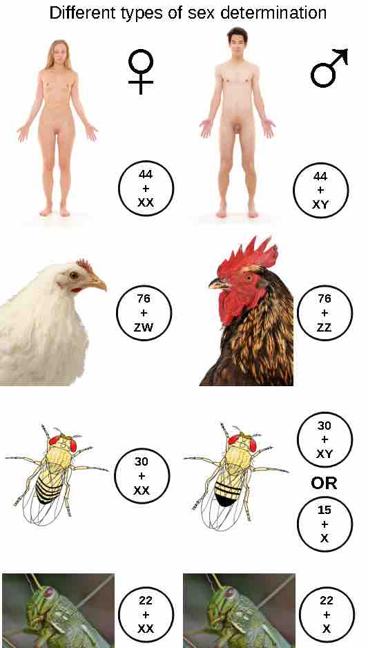 The presence of X and Y chromosomes are one of the factors responsible for sex determination in mammals, with males being the heterozygous sex. In birds, Z and W chromosomes determine sex, with females being the heterozygous sex.