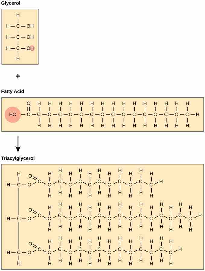 Triacylglycerol is formed by the joining of three fatty acids to a glycerol backbone in a dehydration reaction. Three molecules of water are released in the process.