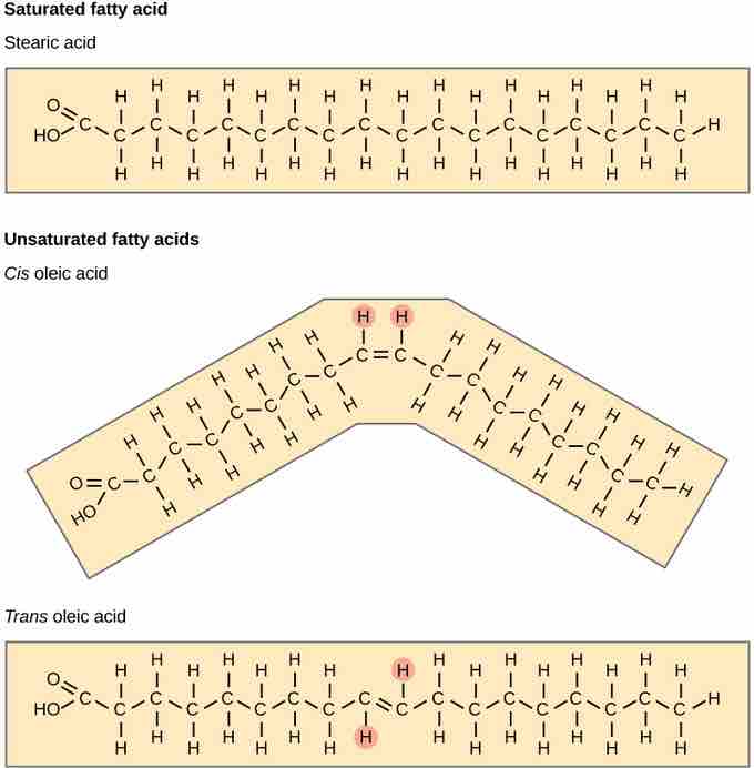 Saturated fatty acids have hydrocarbon chains connected by single bonds only. Unsaturated fatty acids have one or more double bonds. Each double bond may be in a cis or trans configuration. In the cis configuration, both hydrogens are on the same side of the hydrocarbon chain. In the trans configuration, the hydrogens are on opposite sides. A cis double bond causes a kink in the chain.