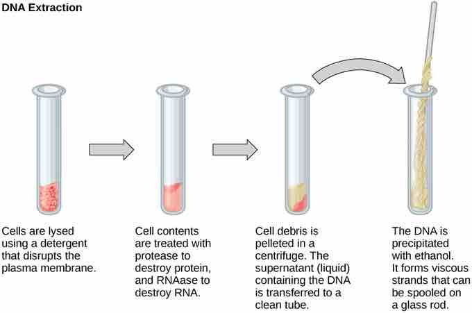 To study or manipulate nucleic acids, the DNA or RNA must first be isolated or extracted from the cells. This can be done through various techniques . Most nucleic acid extraction techniques involve steps to break open the cell and use enzymatic reactions to destroy all macromolecules that are not desired (such as degradation of unwanted molecules and separation from the DNA sample). Cells are broken using a lysis buffer (a solution that is mostly a detergent); lysis means "to split." These enzymes break apart lipid molecules in the membranes of the cell and the nucleus. Macromolecules are inactivated using enzymes such as proteases that break down proteins, and ribonucleases (RNAses) that break down RNA. The DNA is then precipitated using alcohol. Human genomic DNA is usually visible as a gelatinous, white mass. Samples can be stored at –80°C for years.