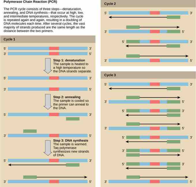 Polymerase chain reaction, or PCR, is used to amplify a specific sequence of DNA. Primers—short pieces of DNA complementary to each end of the target sequence—are combined with genomic DNA, Taq polymerase, and deoxynucleotides. Taq polymerase is a DNA polymerase isolated from the thermostable bacterium Thermus aquaticus that is able to withstand the high temperatures used in PCR. Thermus aquaticus grows in the Lower Geyser Basin of Yellowstone National Park. Reverse transcriptase PCR (RT-PCR) is similar to PCR, but cDNA is made from an RNA template before PCR begins.