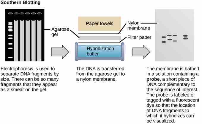 Nucleic acid samples, such as fragmented genomic DNA and RNA extracts, can be probed for the presence of certain sequences. Short DNA fragments called probes are designed and labeled with radioactive or fluorescent dyes to aid detection. Gel electrophoresis separates the nucleic acid fragments according to their size. The fragments in the gel are then transferred onto a nylon membrane in a procedure called blotting . The nucleic acid fragments that are bound to the surface of the membrane can then be probed with specific radioactively- or fluorescently-labeled probe sequences. When DNA is transferred to a nylon membrane, the technique is called Southern blotting; when RNA is transferred to a nylon membrane, it is called northern blotting. Southern blots are used to detect the presence of certain DNA sequences in a given genome, and northern blots are used to detect gene expression.