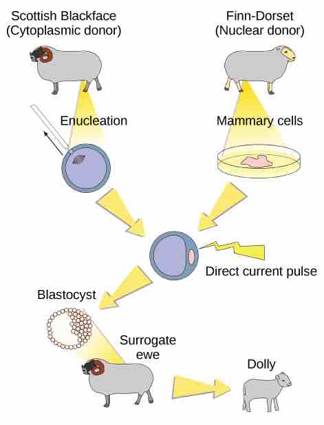 Dolly the sheep was the first mammal to be cloned. To create Dolly, the nucleus was removed from a donor egg cell. The nucleus from a second sheep was then introduced into the cell, which was allowed to divide to the blastocyst stage before being implanted in a surrogate mother.