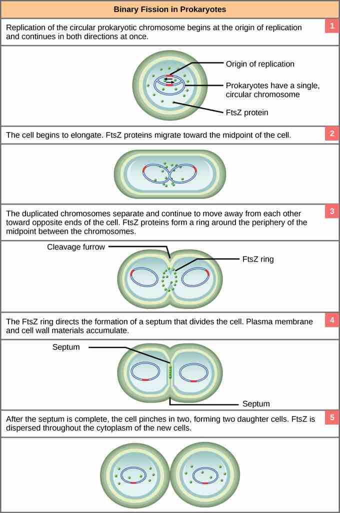 The bacterial chromosome is attached to the plasma membrane at about the midpoint of the cell. The starting point of replication, the origin, is close to the binding site of the chromosome at the plasma membrane . Replication of the DNA is bidirectional, moving away from the origin on both strands of the loop simultaneously. As the new double strands are formed, each origin point moves away from the cell wall attachment toward the opposite ends of the cell. As the cell elongates, the growing membrane aids in the transport of the chromosomes. After the chromosomes have cleared the midpoint of the elongated cell, cytoplasmic separation begins. The formation of a ring composed of repeating units of a protein, FtsZ, directs the partition between the nucleoids. Formation of the FtsZ ring triggers the accumulation of other proteins that work together to recruit new membrane and cell wall materials to the site. A septum is formed between the nucleoids, extending gradually from the periphery toward the center of the cell. When the new cell walls are in place, the daughter cells separate.
